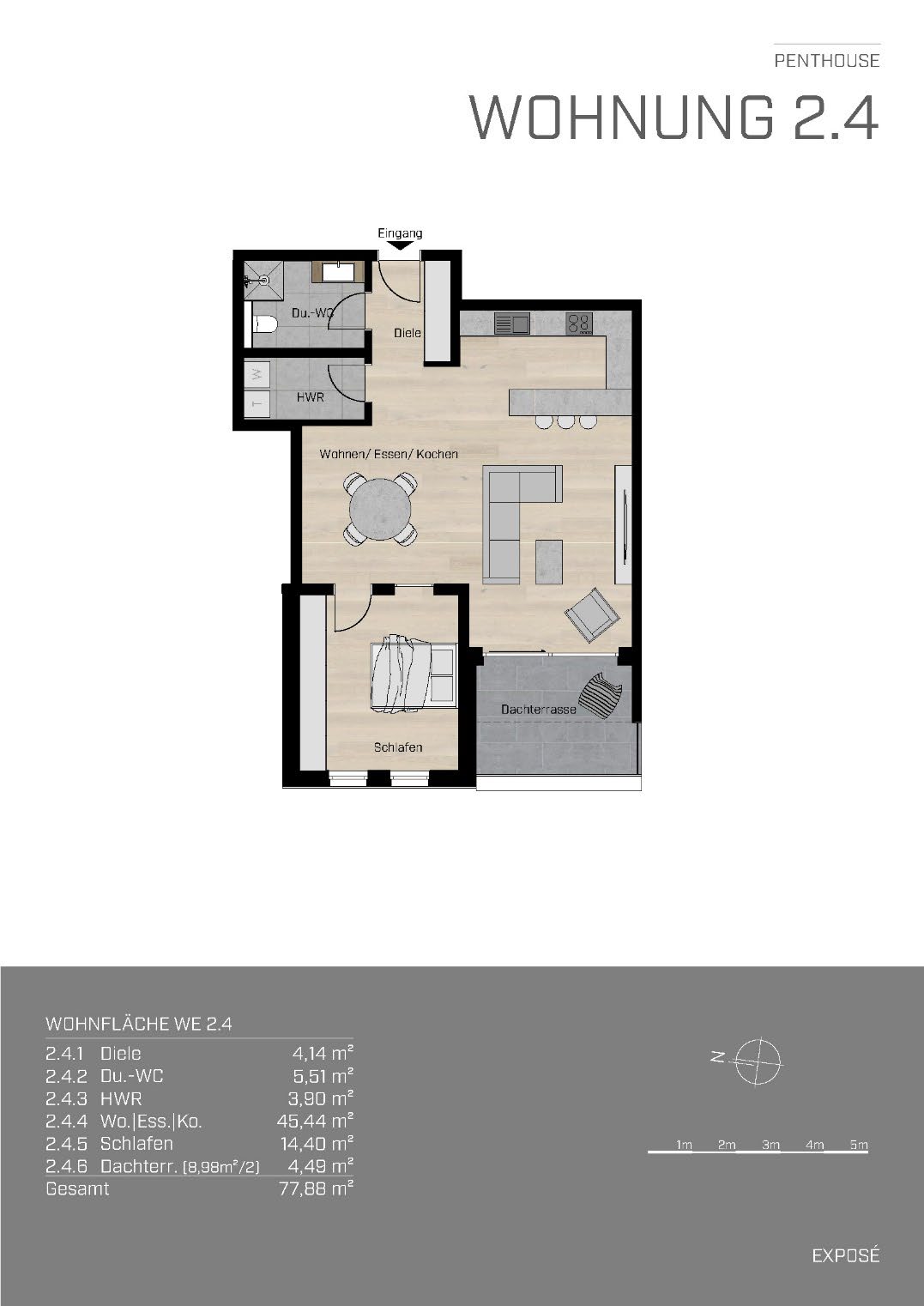 Penthouse-Wohnung im 2. Obergeschoss mit offenem Wohn-/Essbereich und Küche, Schlafzimmer, Dusche/WC, HWR und Dachterrasse.